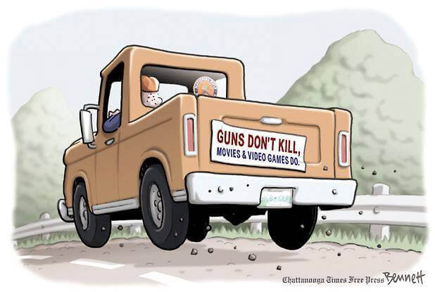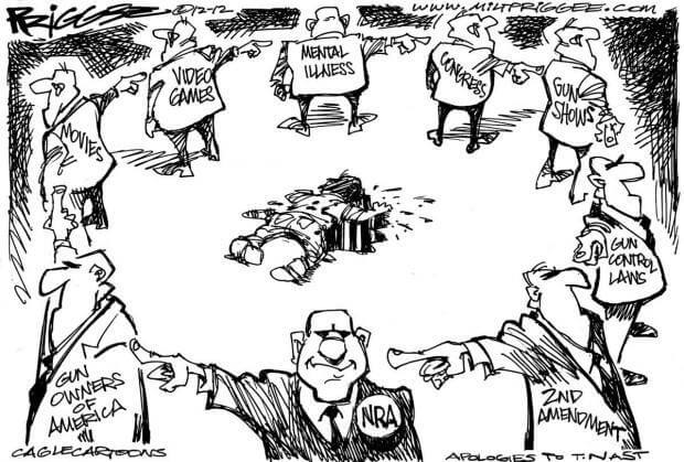 Whenever there’s a well-publicized shooting in the US, those who support the idea that everyone has the right to own any sort of gun begin the Blame Game. Leading the Blame Game is the NRA, who feed the Blame Game machine.