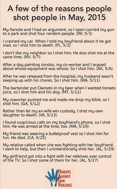 Most gun deaths in the US are the result of suicide. Mental Health professionals tell us that if people try to kill themselves and fail, or cannot find an easy way to die, most often they can be brought back from that dark place. But if they have a gun, there’s a pretty good chance they will be successful. Thousands of people die in the US each year that might live, just because they have easy access to a gun.